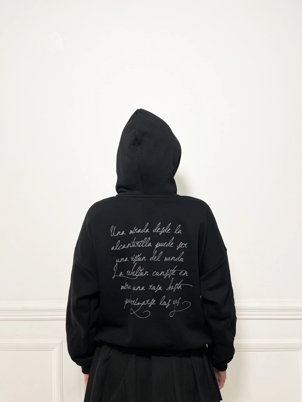 Buzo de frisa de algodón con capucha forrrada. Estampado en la espalda con poema de Alejandra Pizarnik.