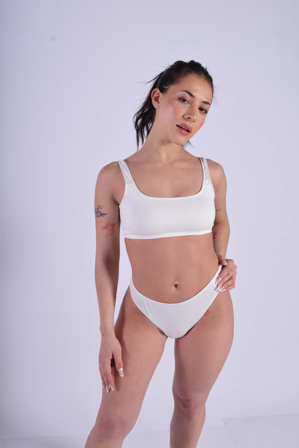 Corpiño de estilo deportivo confeccionado en Jersey Soft. Delantero con doble tela, breteles anchos y fijos.
