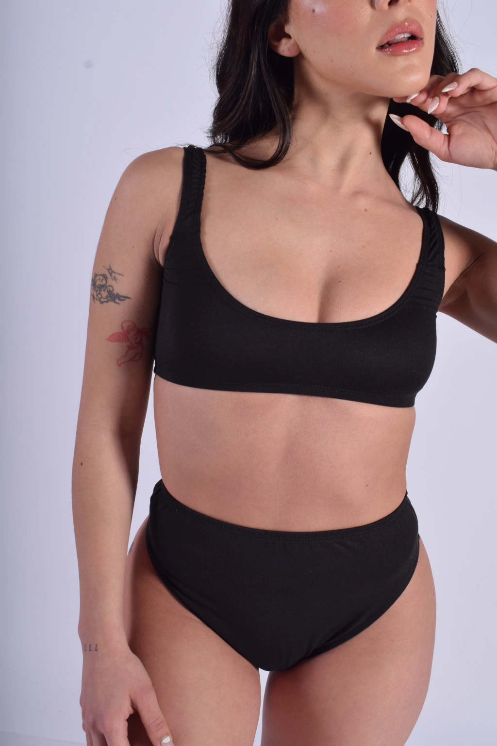 Corpiño de estilo deportivo confeccionado en Jersey Soft. Delantero con doble tela, breteles anchos y fijos.
