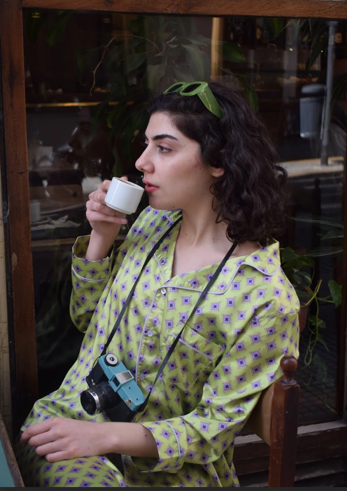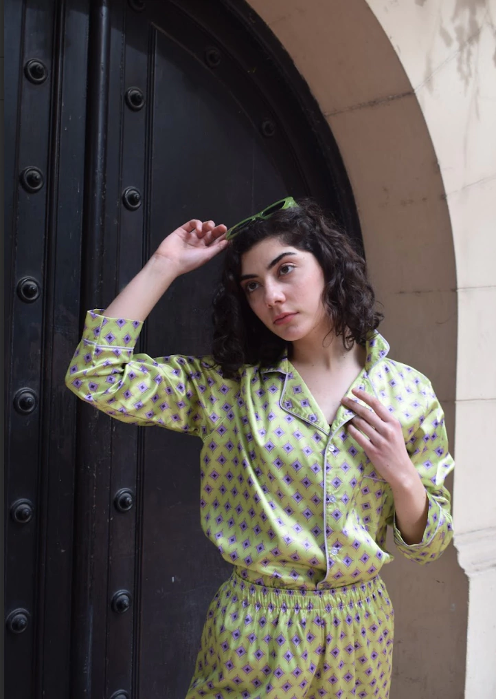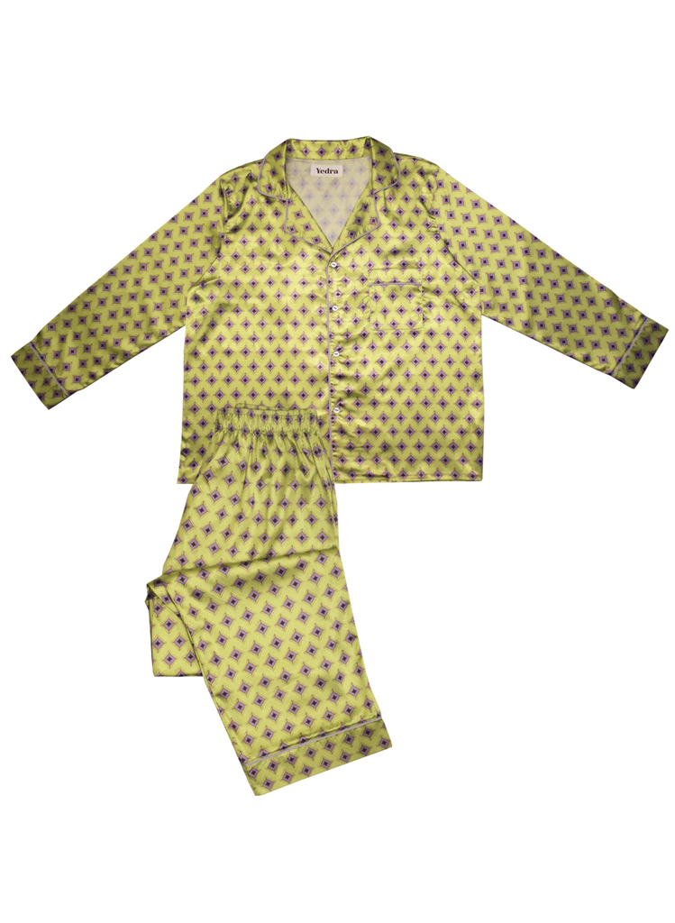 Piyama camisero clásico de dos piezas de satén elastizado. Estampado con un diseño original de Yedra.
